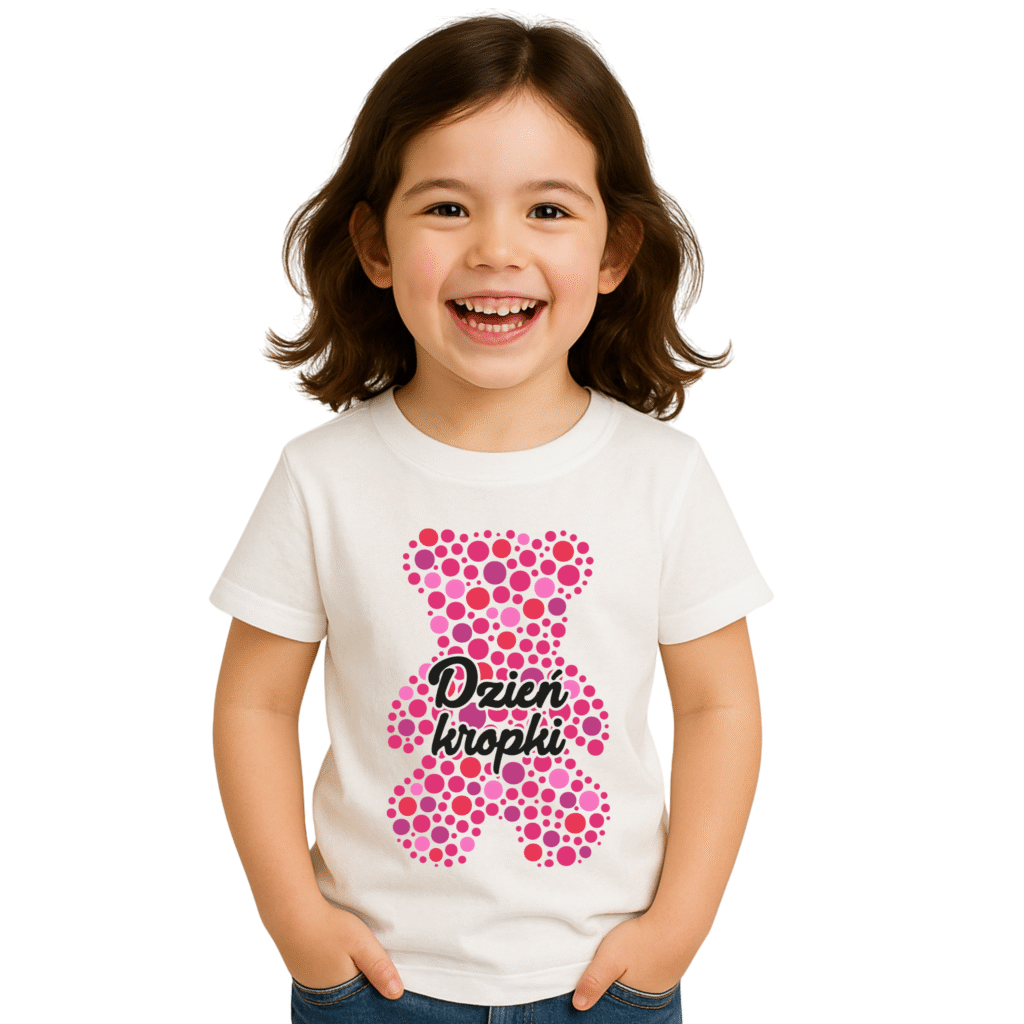 Koszulka dziecięca na Dzień Kropki – różowy miś z kropek