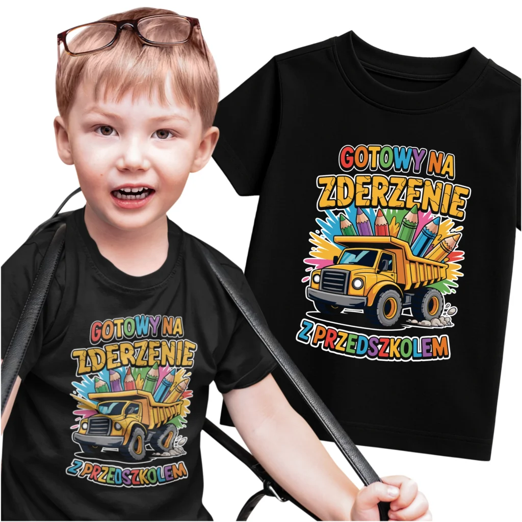 Ten wzór z żółtą wywrotką wypchaną kredkami to zabawny i odważny sposób na oswojenie przedszkolnych emocji. Tekst „Gotowy na zderzenie z przedszkolem” rozładowuje napięcie i gwarantuje uśmiech – zarówno u malucha, jak i nauczycieli.