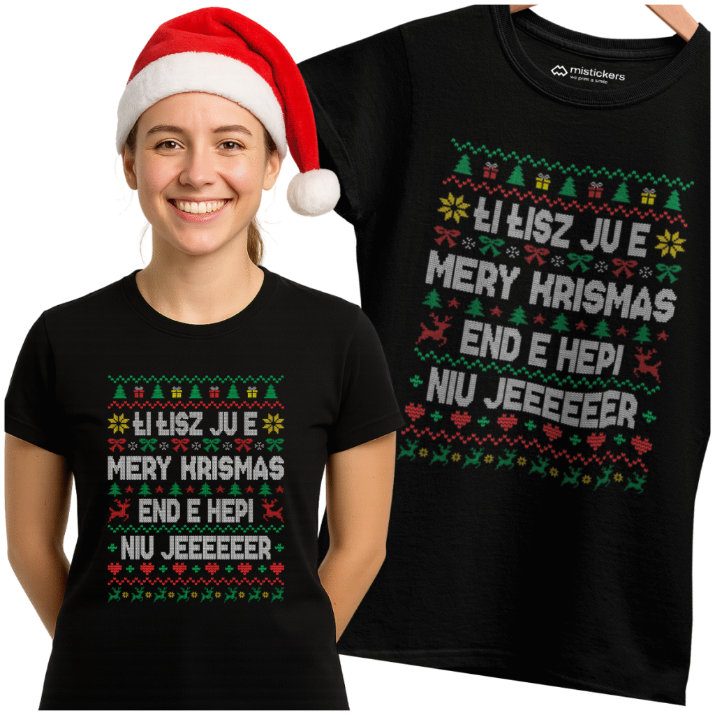 Nadruk stylizowany na świąteczny sweter i tekst w fonetycznym „polglishu” rozbawi każdego przy stole — od teściowej po wujka z gitarą 🎶