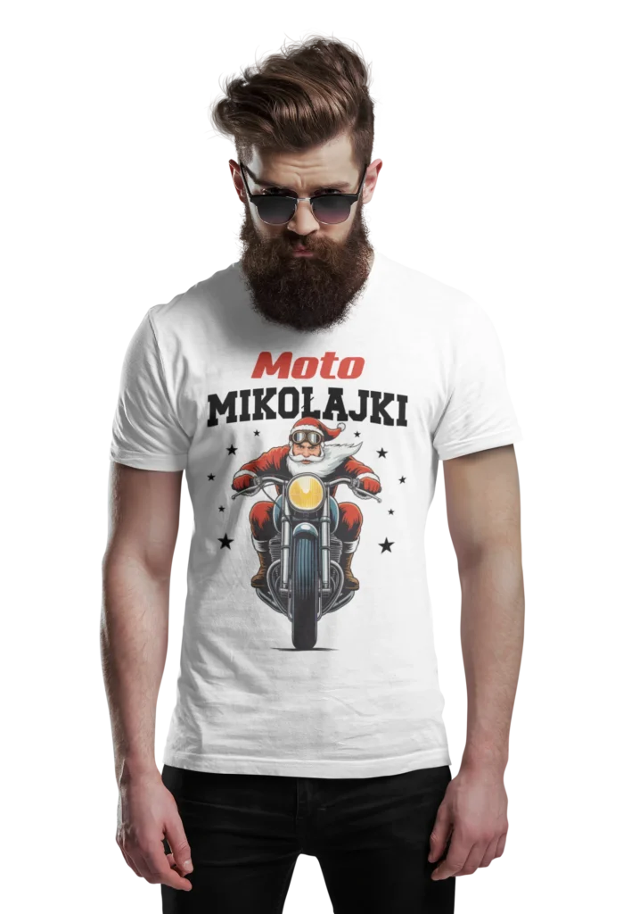 Zabawna koszulka „Moto Mikołajki” to obowiązkowy strój każdego motocyklisty, który nie zwalnia nawet zimą.