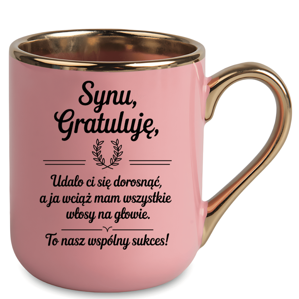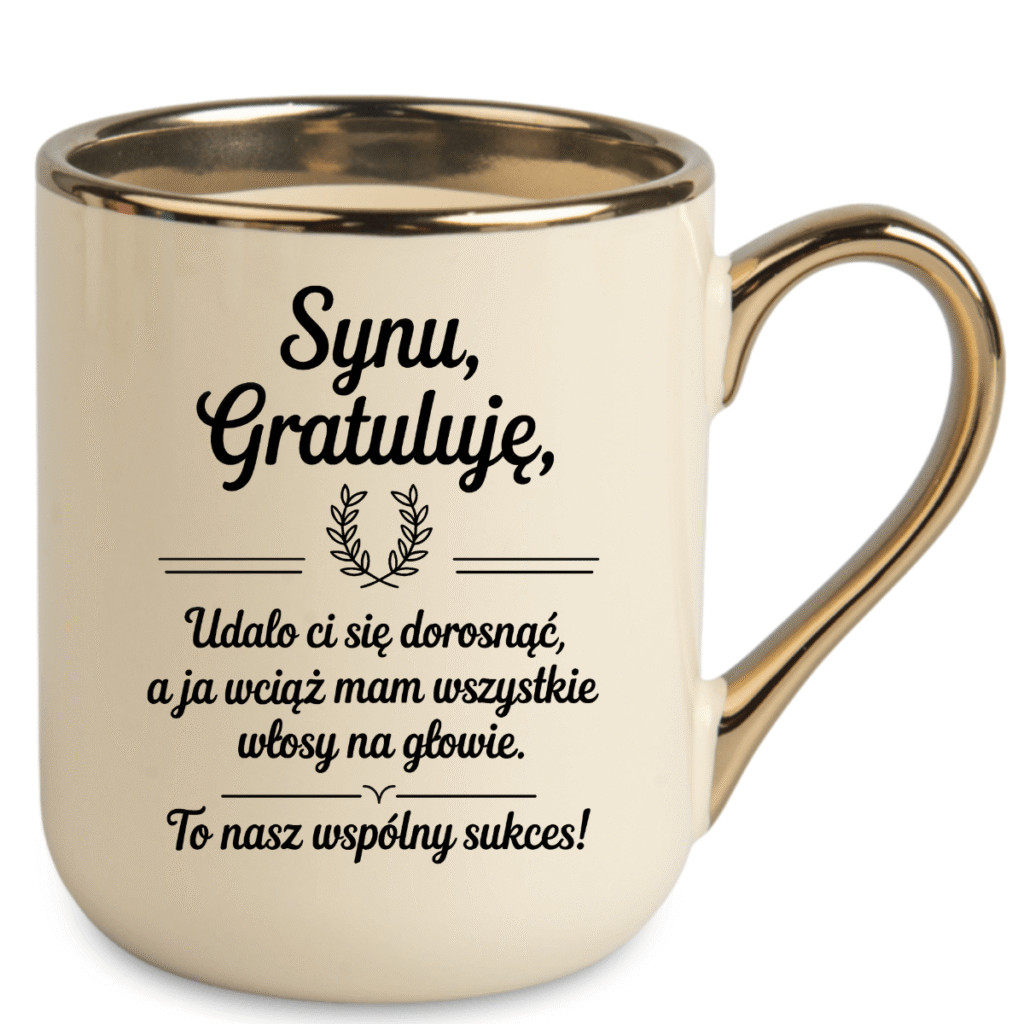 - elegancki kubek ze złotym uchem – wygląda na porządny prezent, mimo żartobliwej treści