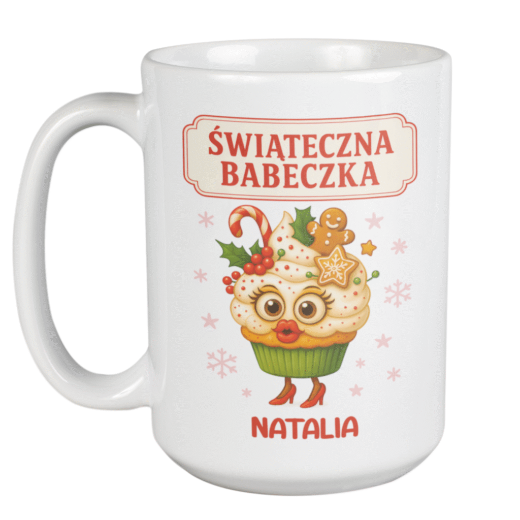 Kubek „Świąteczna Babeczka” z personalizowanym imieniem to idealny pomysł na prezent dla każdej kobiety, która lubi świąteczny klimat i odrobinę humoru.