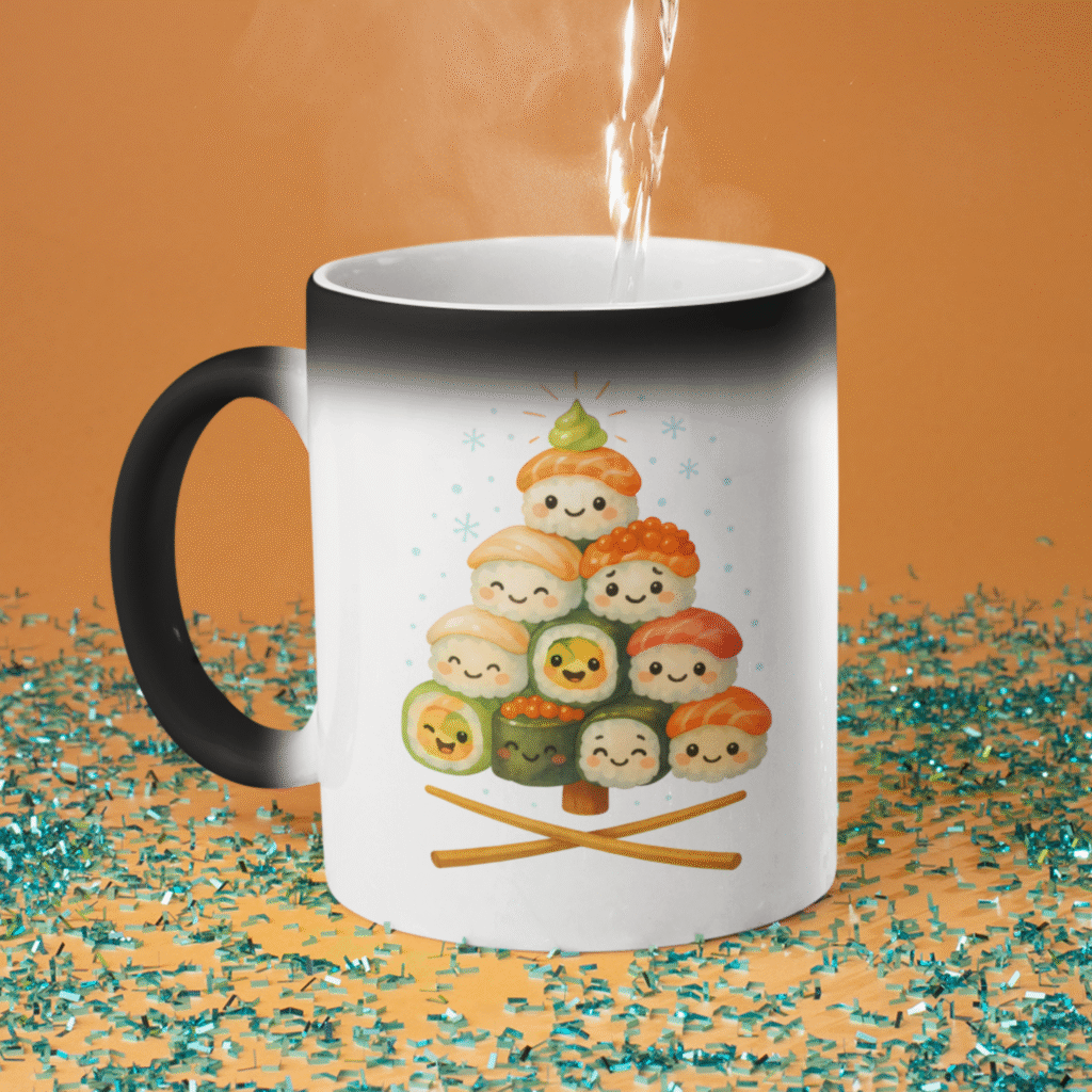 Ten kubek to połączenie świątecznego klimatu z japońskim smakiem humoru – idealny dla każdego, kto uwielbia sushi i lubi zaczynać dzień z uśmiechem.