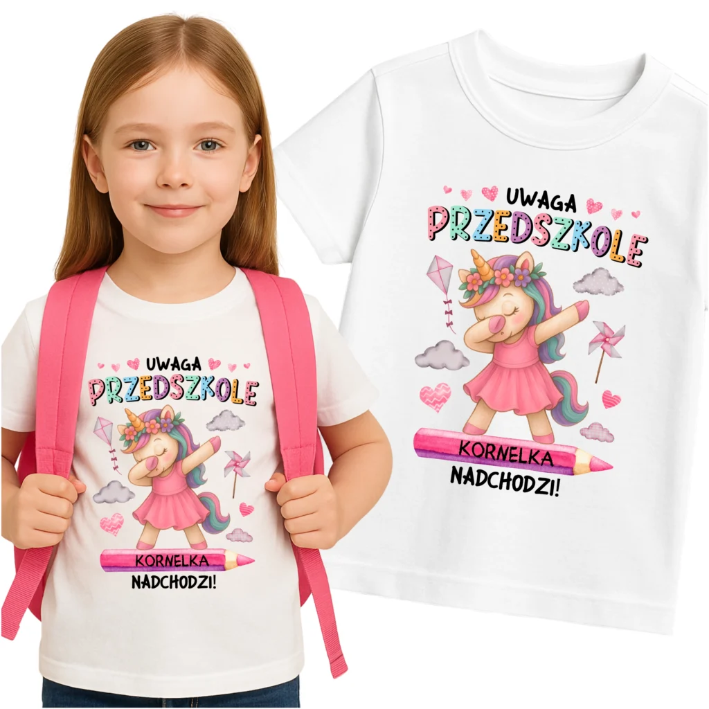 Na przodzie: kolorowy napis „Uwaga PRZEDSZKOLE”, zabawny dabbing jednorożec w sukience oraz imię na gigantycznej kredce – no przecież nie da się tego nie pokochać! ?