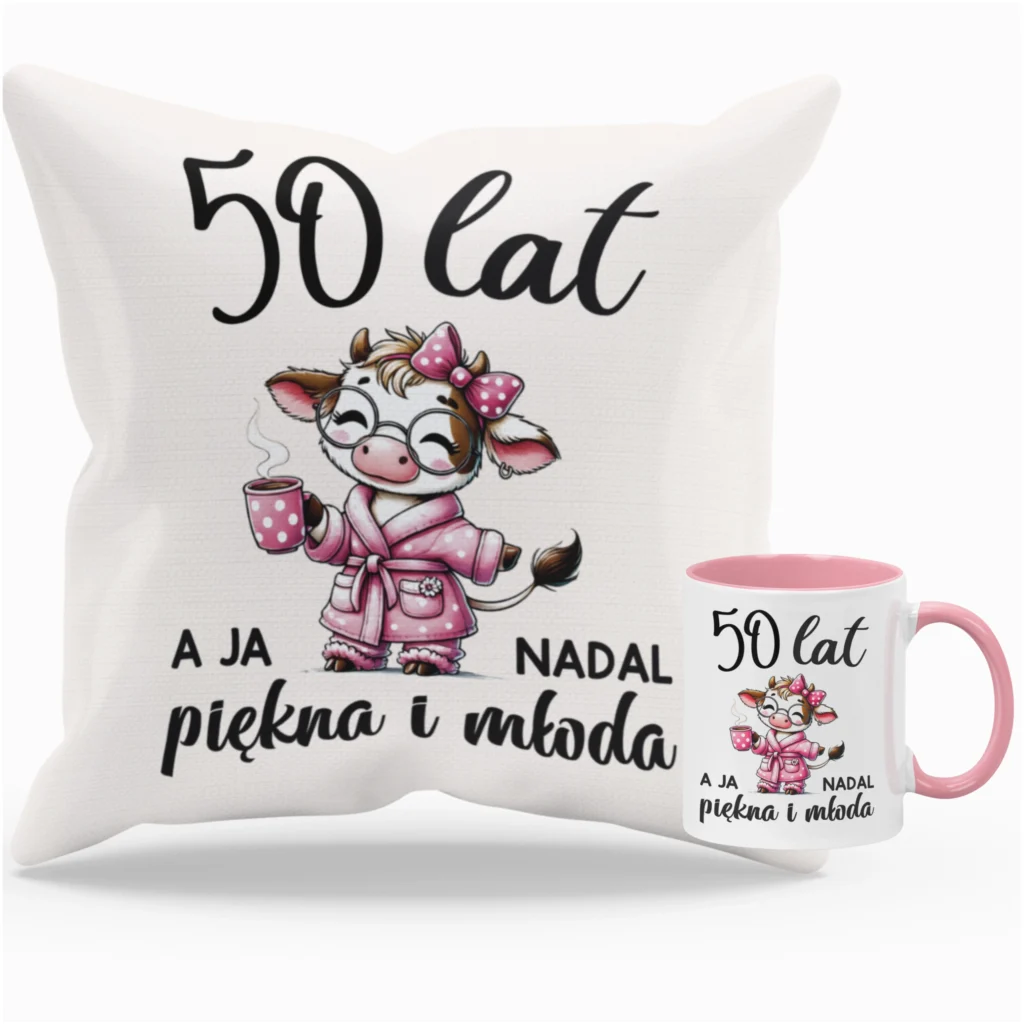 Jeśli szukasz prezentu, który mówi: „Wiek to tylko liczba, a Ty nadal masz to coś” – właśnie go znalazłeś! Ten zestaw z uśmiechniętą krówką w różowym szlafroku to idealny podarunek dla kobiety, która w dniu swoich 50. urodzin nie traci ani poczucia humoru, ani wdzięku.